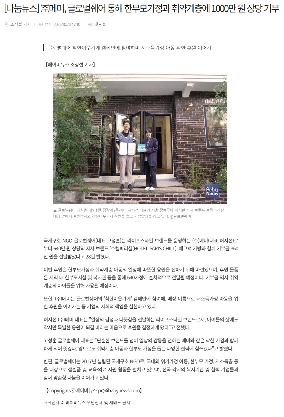 [BabyNews] ㈜메미, 글로벌쉐어 통해 한부모가정과 취약계층에 1000만 원 상당 기부