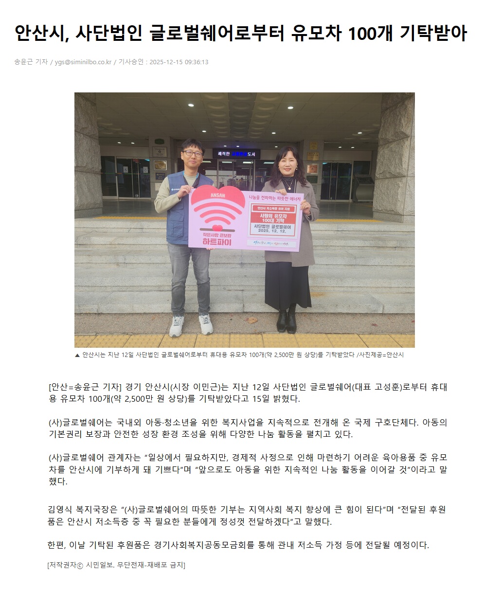 [시민일보] 안산시, 사단법인 글로벌쉐어로부터 유모차 100개 기탁받아