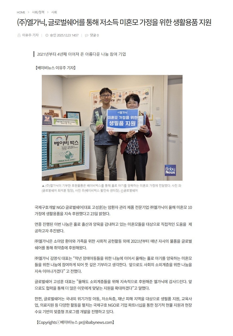 [BabyNews] (주)엘가닉, 글로벌쉐어를 통해 저소득 미혼모 가정을 위한 생활용품 지원