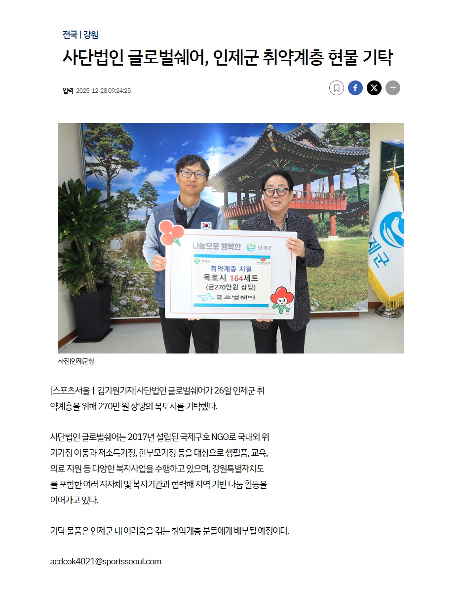 [스포츠서울] 사단법인 글로벌쉐어, 인제군 취약계층 현물 기탁
