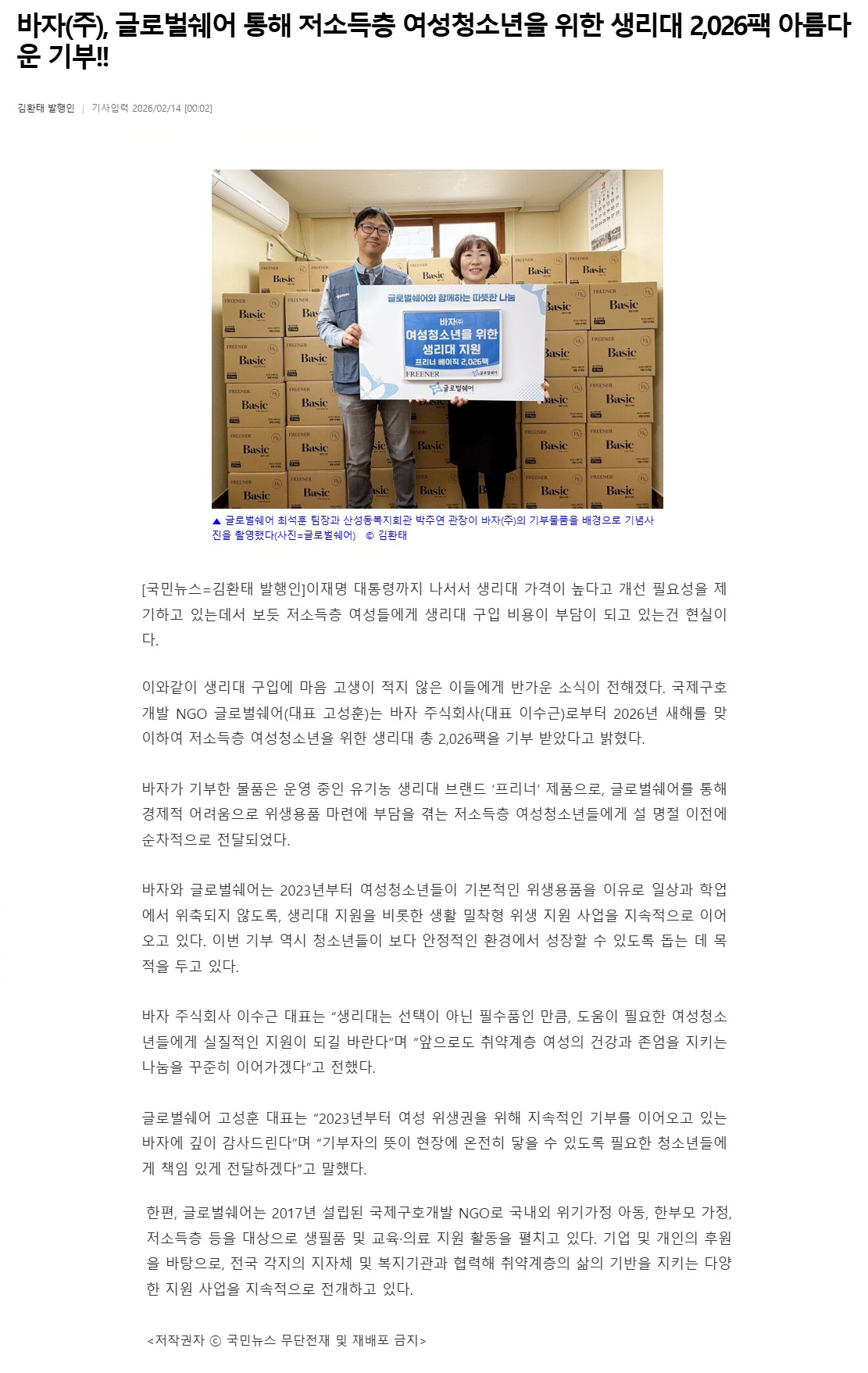 [국민뉴스] 바자(주), 글로벌쉐어 통해 저소득층 여성청소년을 위한 생리대 2,026팩 아름다운 기부