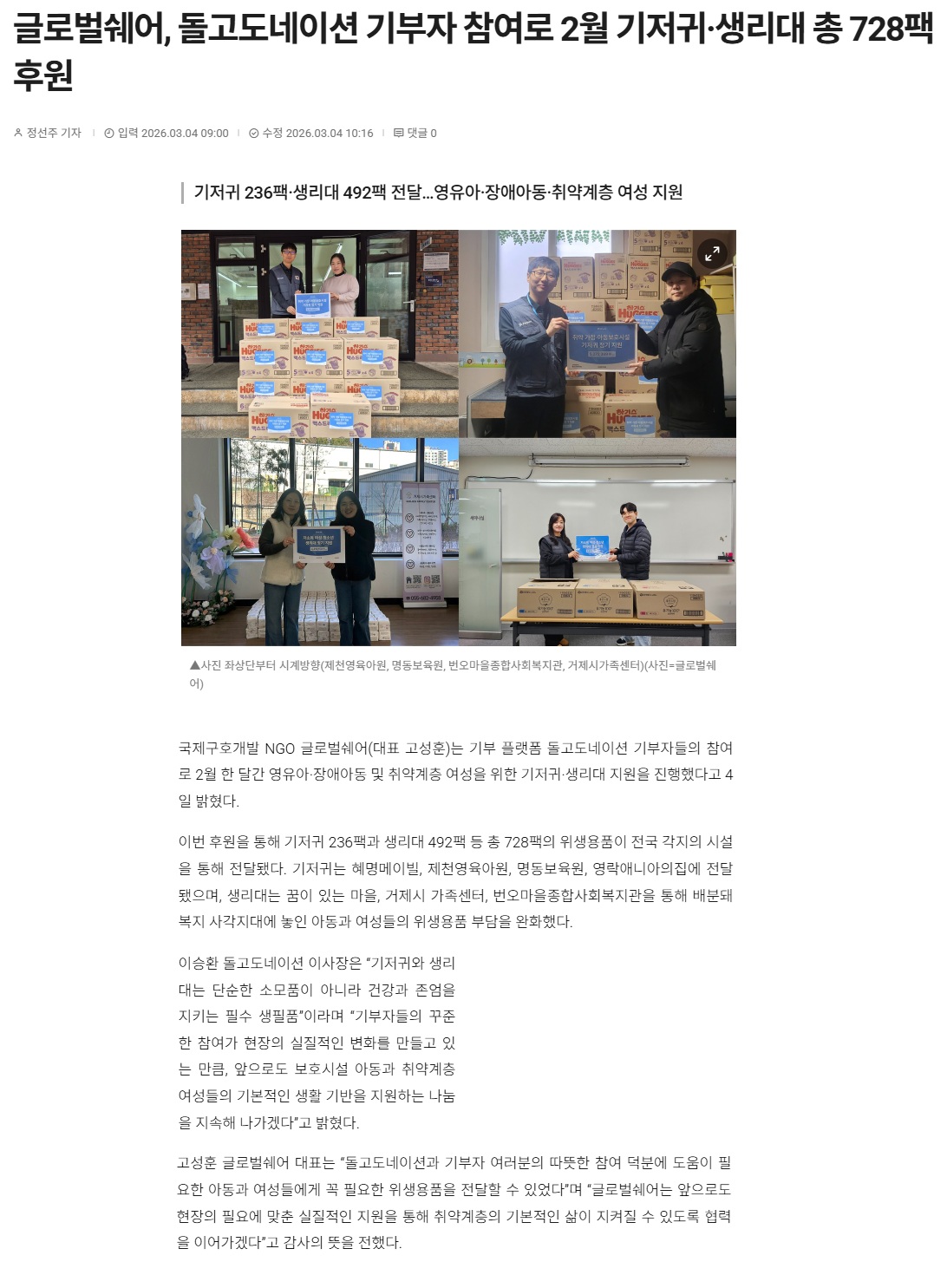 [한국투데이] 글로벌쉐어, 돌고도네이션 기부자 참여로 2월 기저귀·생리대 총 728팩 후원