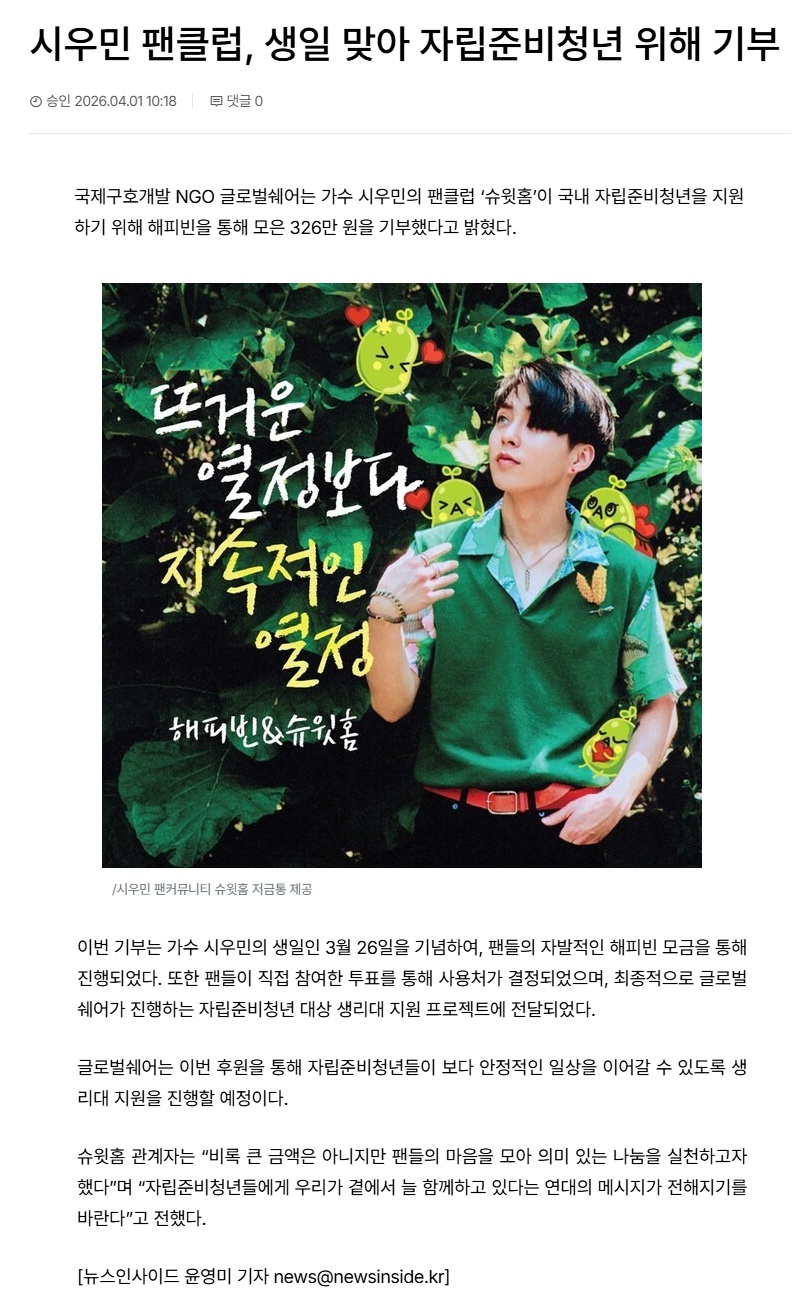 [뉴스인사이드] 시우민 팬클럽, 생일 맞아 자립준비청년 위해 기부