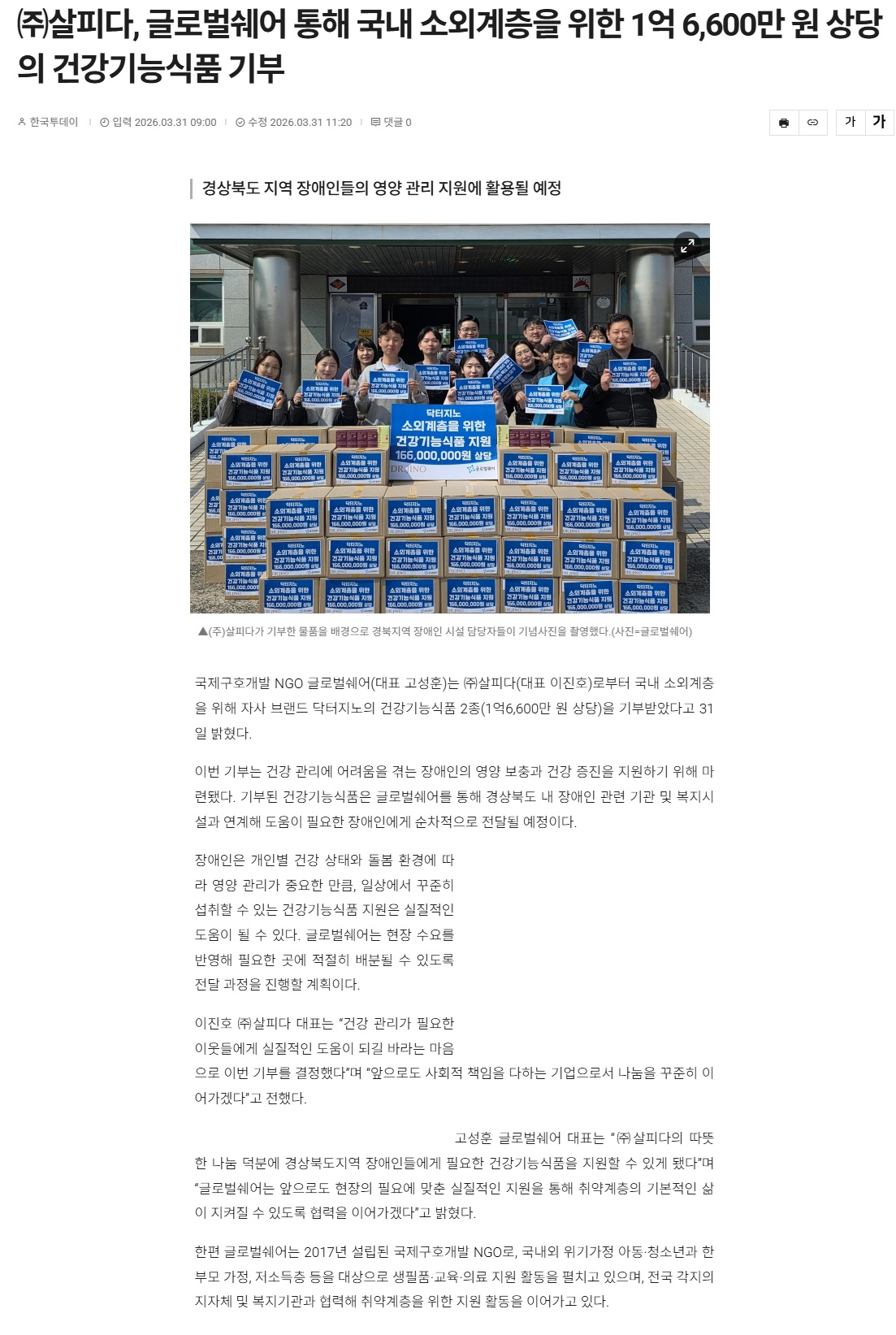 [한국투데이] ㈜살피다, 글로벌쉐어 통해 국내 소외계층을 위한 1억 6,600만 원 상당의 건강기능식품 기부