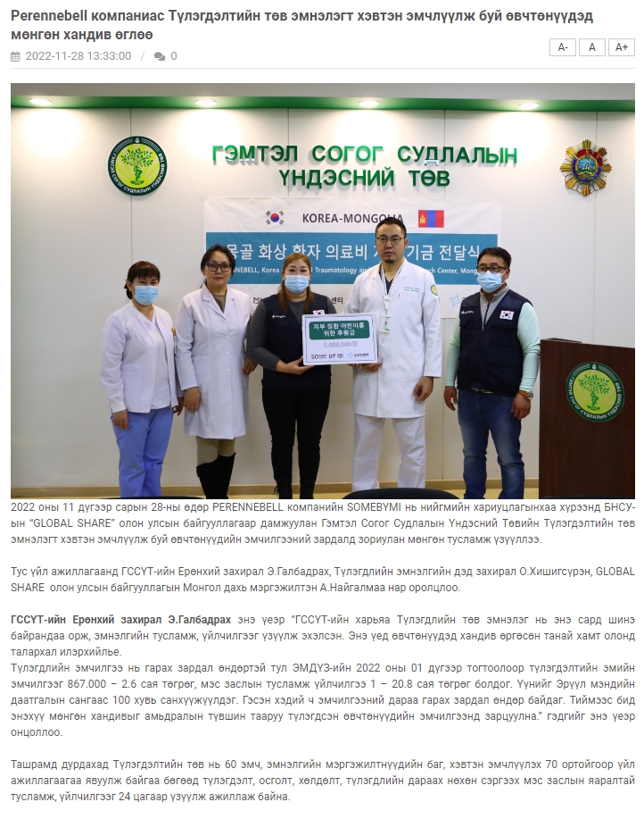 이에 국립중증외상센터 E. Galbadrach 원장은 “국립중증외상센터 화상병원은 이번달에 새 건물로 이전해 진료와 서비스를 제공하기 시작했다. 이 시간에 환자들에게 후원금 기부해 주신 동료들에게 감사드립니다.