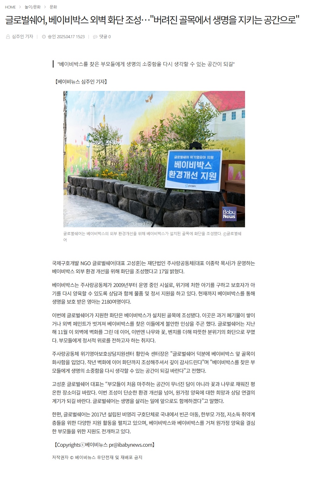 [BabyNews] 글로벌쉐어, 베이비박스 외벽 화단 조성…'버려진 골목에서 생명을 지키는 공간으로'
