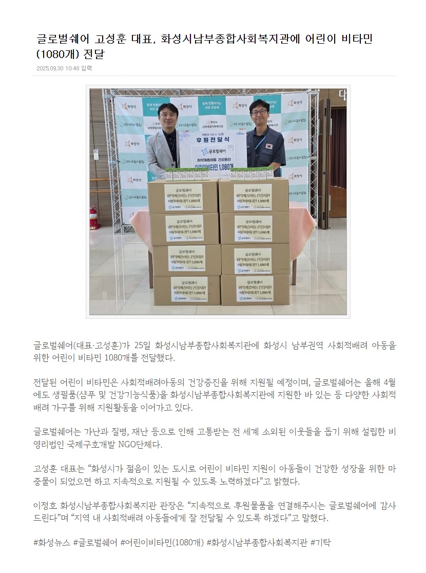 [화성뉴스] 글로벌쉐어, 화성시남부종합사회복지관에 어린이 비타민 전달
