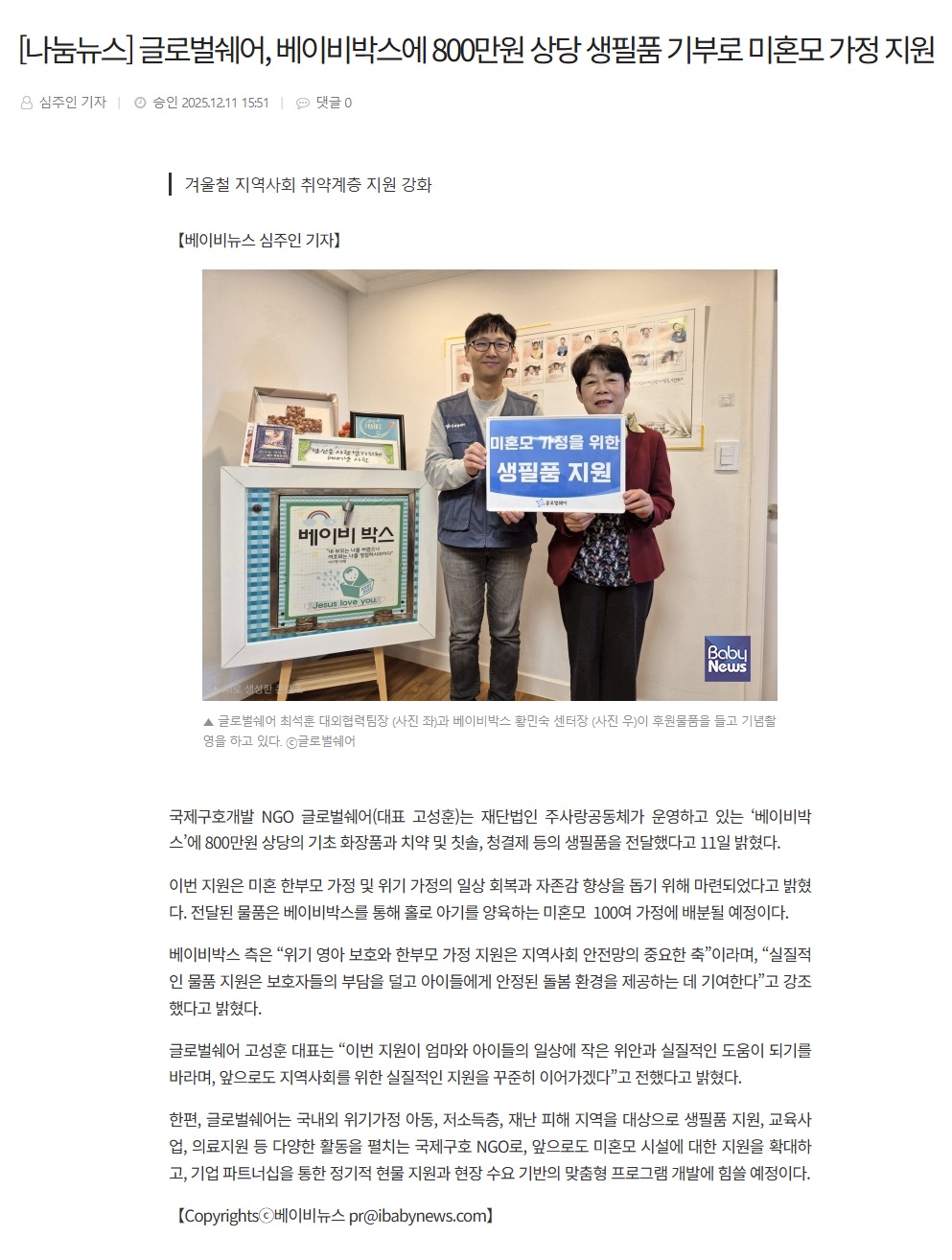 [BabyNews] 글로벌쉐어, 베이비박스에 800만원 상당 생필품 기부로 미혼모 가정 지원